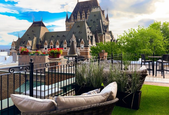 Une terrasse avec vue imprenable sur le Vieux-Québec et le Château Frontenac.