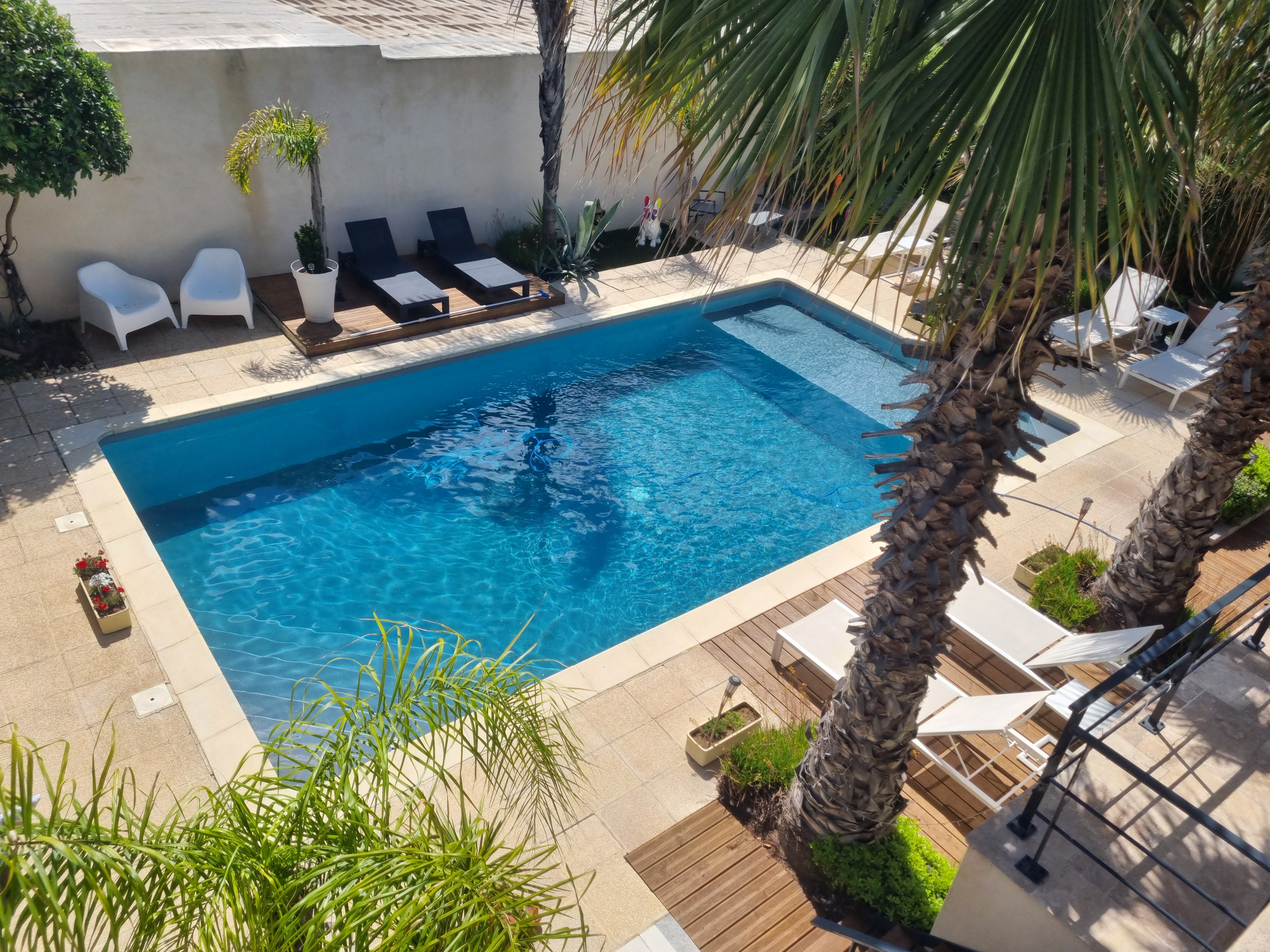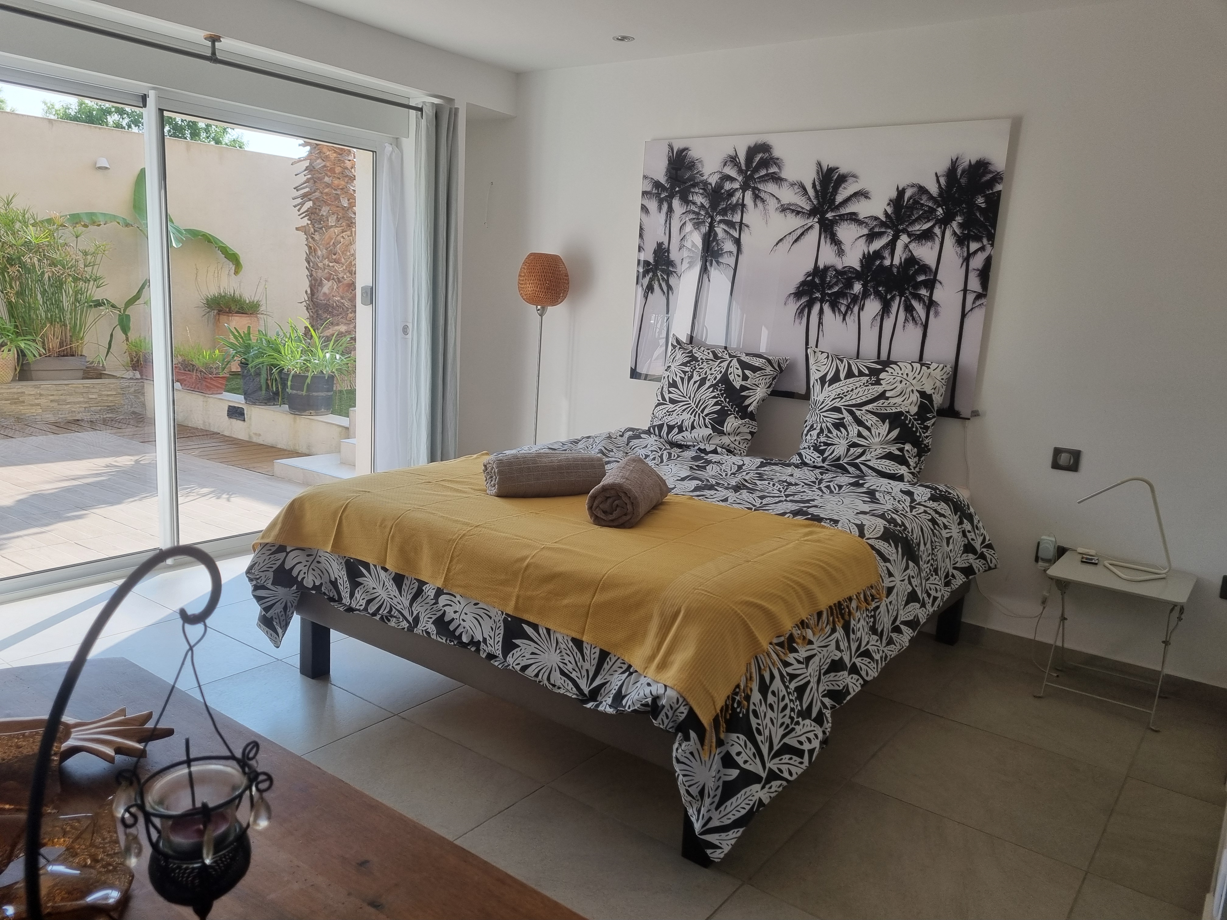 Studio « Palmier » grand studio pouvant accueillir jusqu’à 4 personnes, en rez de jardin avec deux terrasses privées dont une plein sud et une nord pour profiter de l’ombre en pleine saison. un grand lit de 160X200 et deux lits de 90X200 dans une pièce indépendante. salle de bains avec douche 120X80, WC suspendu, cafetière Nespresso, Télévision LCD (hauteur sous plafond dans la salle de bains de 1,90 m !!)