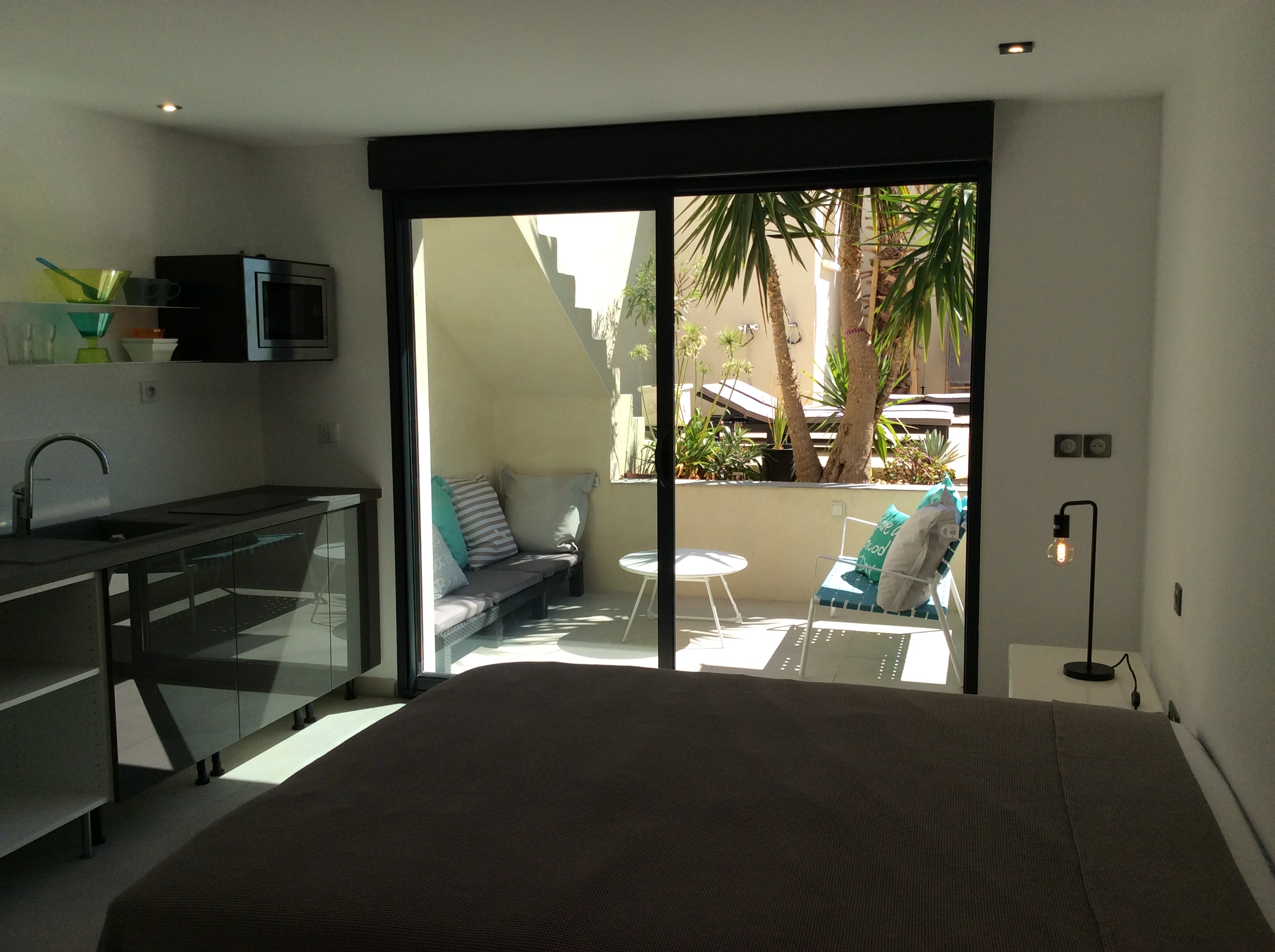 Studio « Yucca » en rez de jardin. Grande baie vitrée de 2,40 m donnant accès à deux terrasses privées (une plein sud et une au nord à l’ombre, canapé d’extérieur. Lit de 160×200, salle de bains avec douche 120×80, WC suspendu, réfrigérateur, cafetière Nespresso, télévision LCD