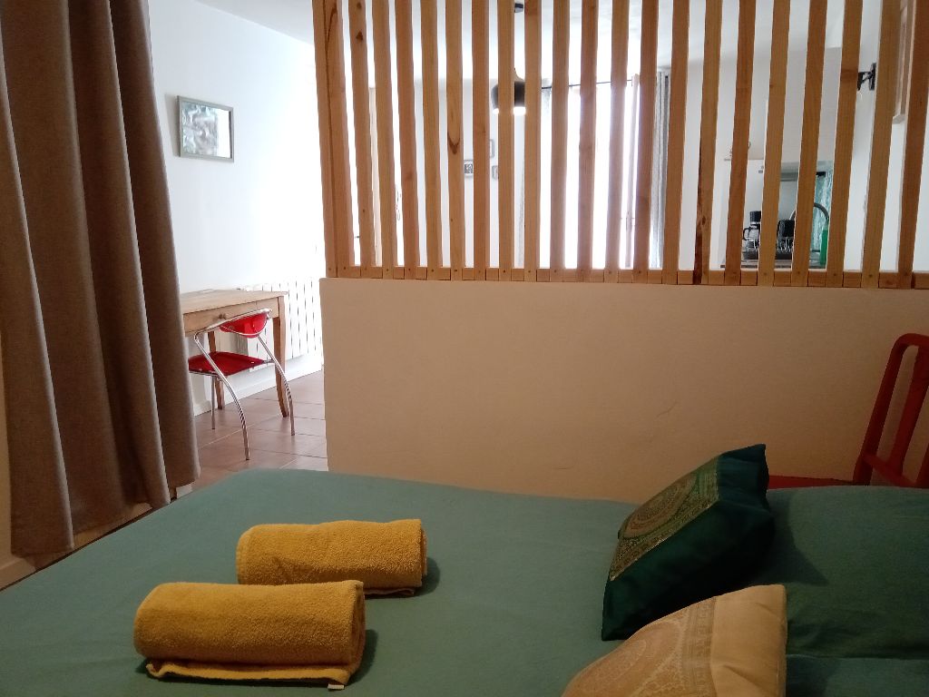 • F2 pour 4 personnes : salle de bains, chambre, salon (bz)/salle à manger/cuisine , patio partagé avec une table partagé avec le studio.
