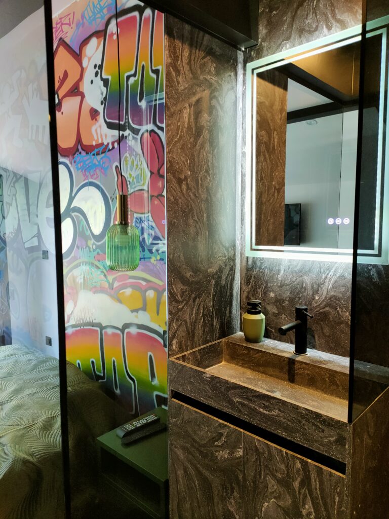 Chambre de 15m² décorée avec goût. Un graffiti "Street Art" habille le mur de la tête de lit réalisé par un jeune artiste local. Elle est équipée d'une salle de douche en corian de couleur noire, et de WC indépendant. Un lit de 160*200 avec un matelas hybride, une télévision et barre de son Bluetooth pour vos soirées Netflix. Une connexion Wifi par fibre.