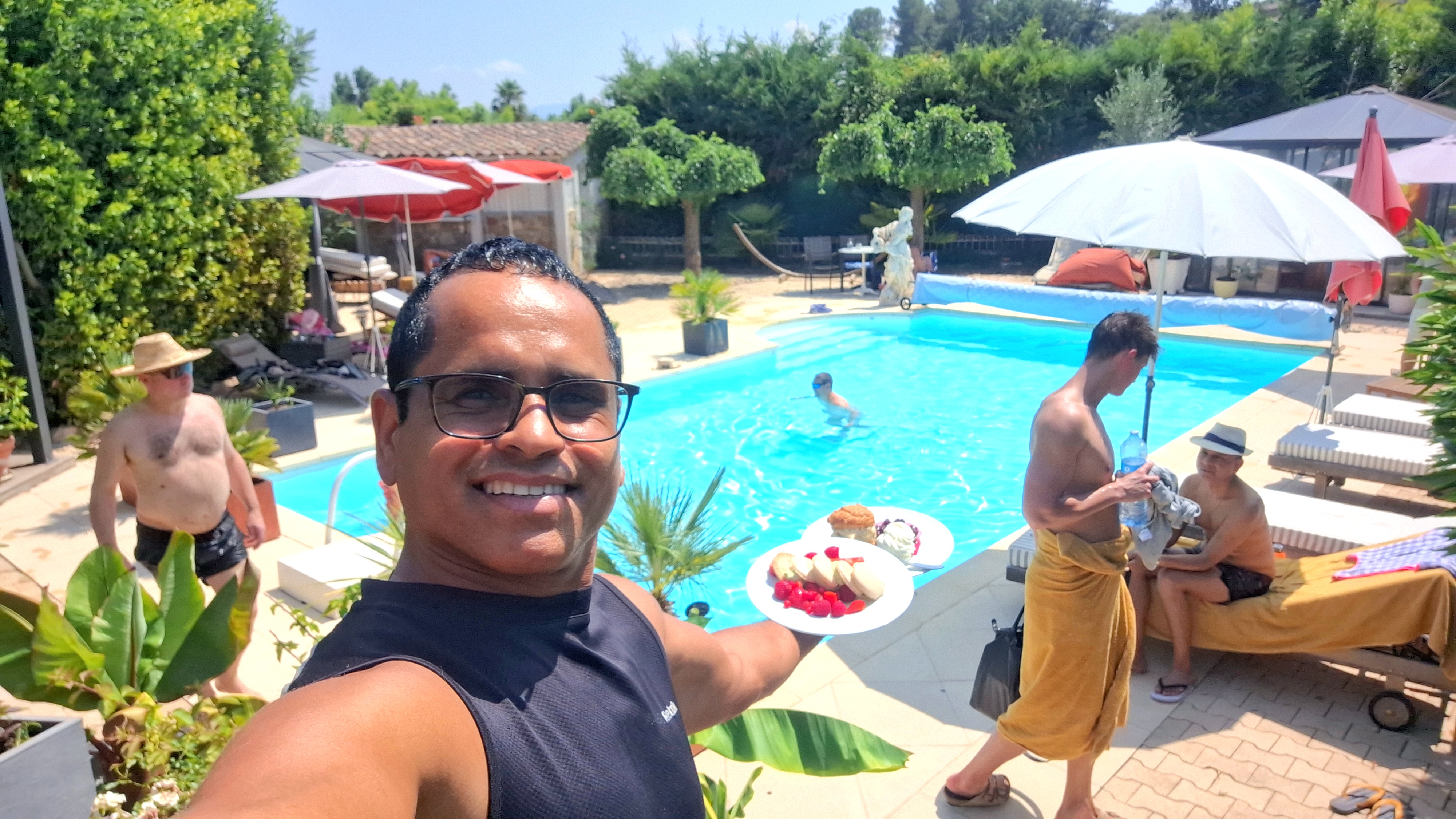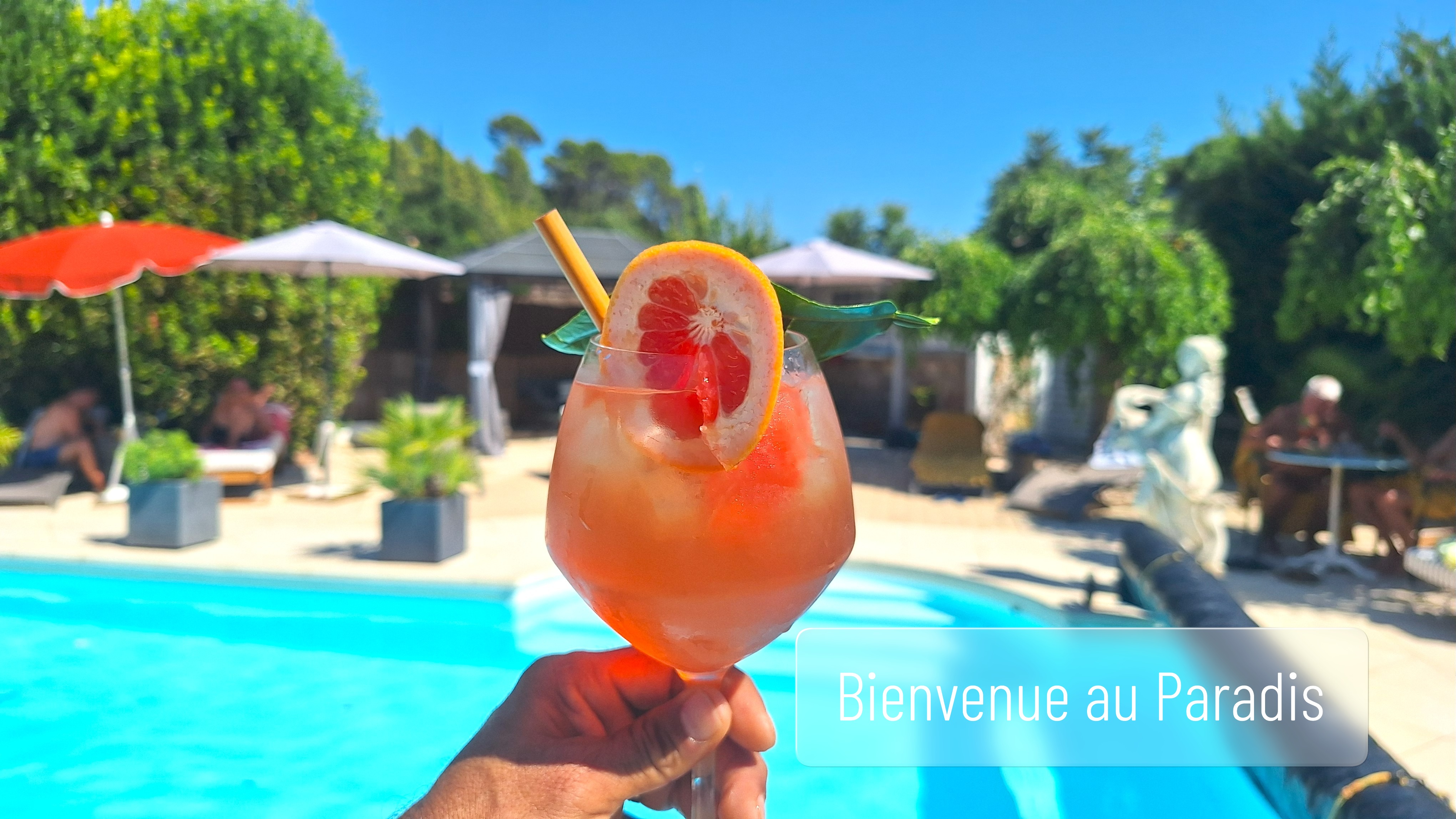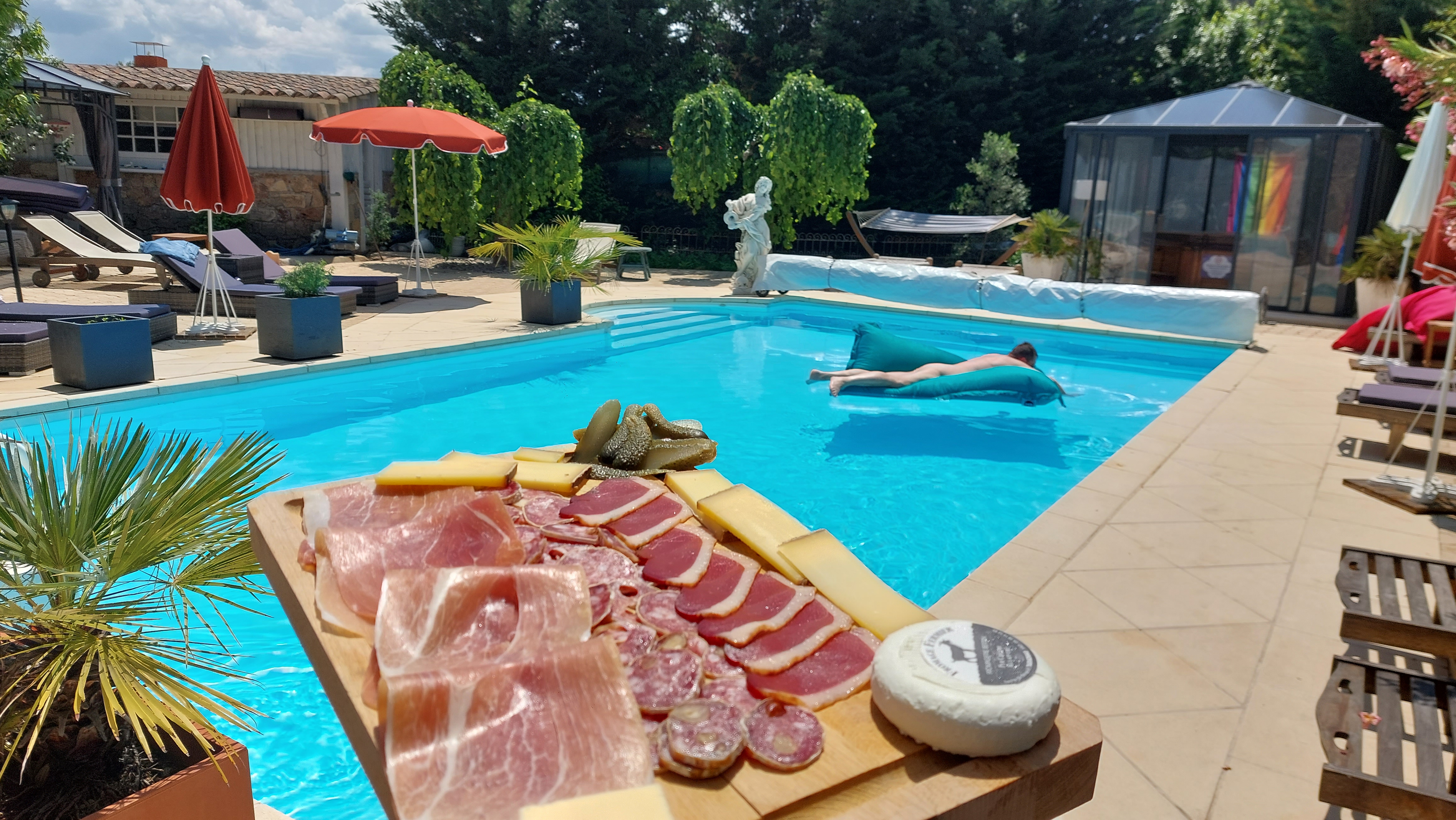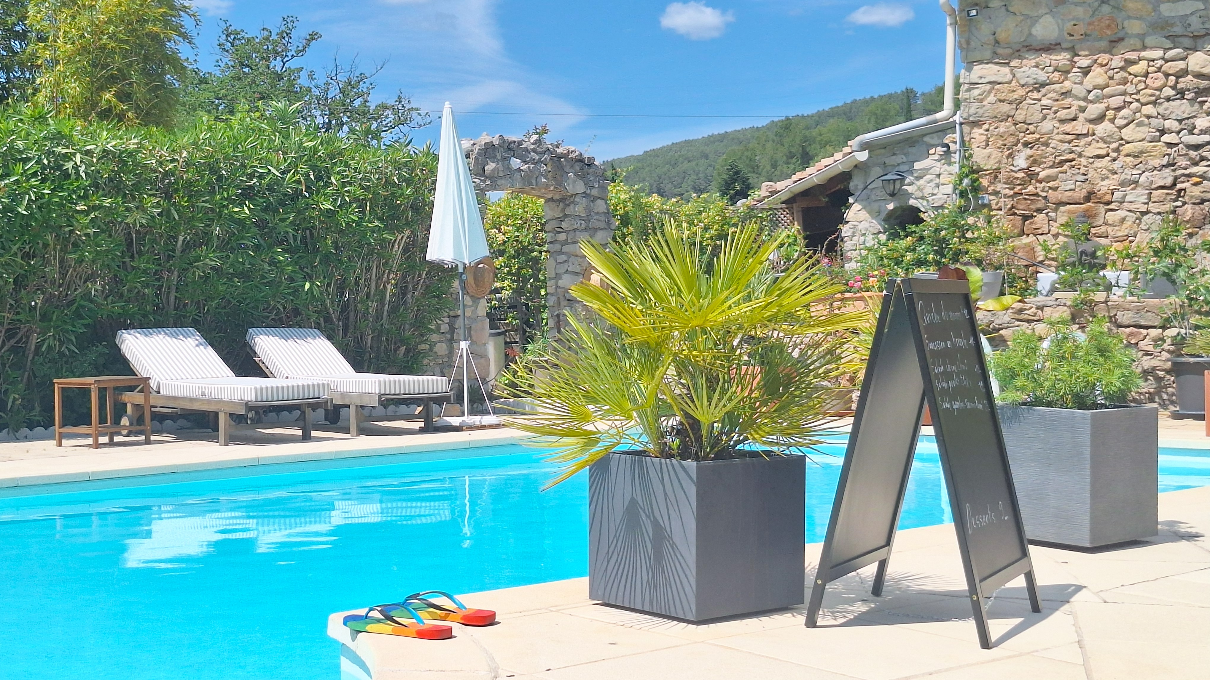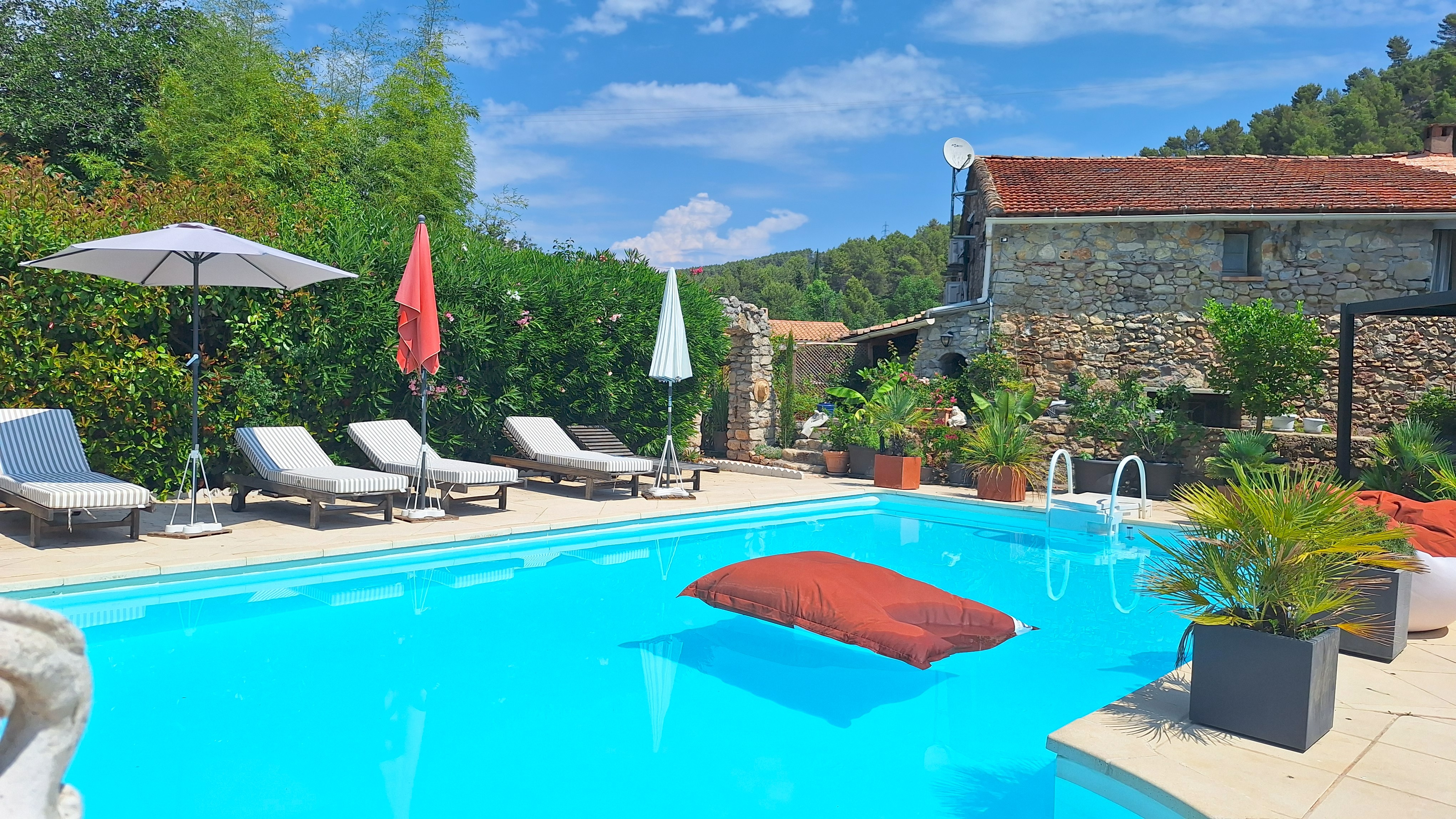 La grande piscine (chauffée de Avril à Octobre) est entourée de petits salons en terrasse (naturisme possible). Un sauna est disponible dans la partie privée de la maison.