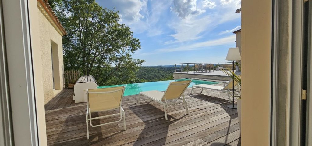 Autour de la maison vous trouverez une magnifique terrasse sans vis à vis avec une vue splendide et sa piscine à débordement. Elle est entourée d'un terrain de plus d'un hectare au calme.