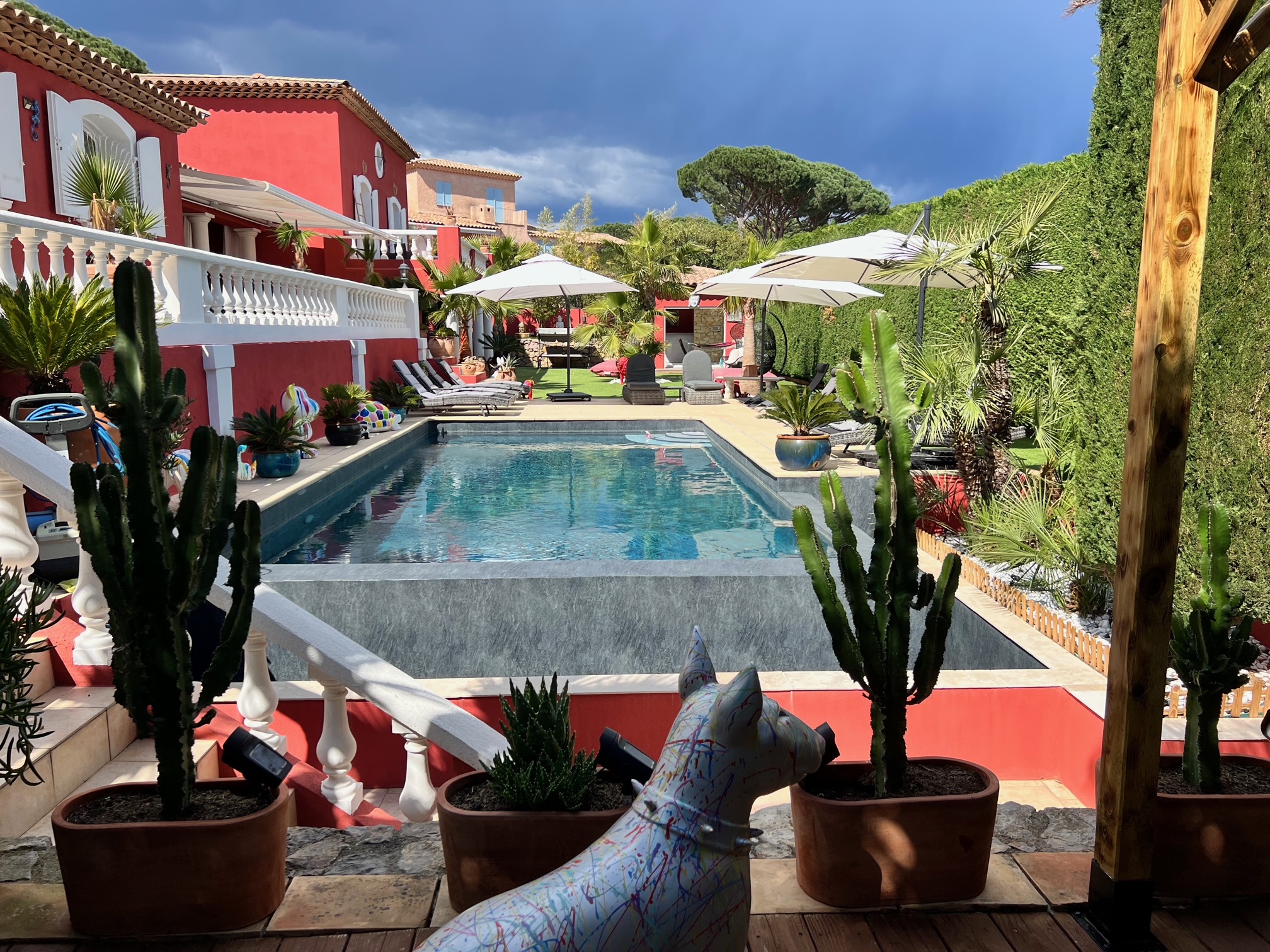 Notre Villa est située dans un quartier securisée sur les hauteurs de Sainte-Maxime, ville située dans le golf de St-Tropez. Les 1eres plages sont à 10 minutes de la Villa et notre propriété est proche de l’accès à l’autoroute A8 ( Sortie 36 Saint Tropez – Sainte Maxime ), vous y apprécierez le confort, le calme et l’emplacement. Un petit havre de paix proche de la ville, des plages et de la Côte d’azur.