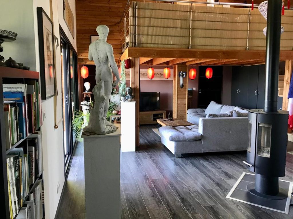 La maison possède un jardin et une terrasse de 30 m2 vers le sud avec une vue dominante sur les montagnes. Son système d'isolation thermique original lui permet d’être classée dans la catégorie A sur l’analyse de performance. La maison possède une climatisation réversible ainsi qu’un poêle à bois. Les moustiquaires sont installées sur les fenêtres.