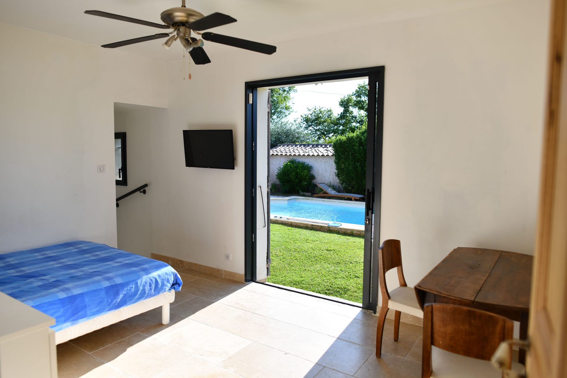 A 8 km de Gordes dans le village de Cabrières d'Avignon, studio tout confort dans propriété. Chambre TV, espace cuisine, salle de bain, parking.