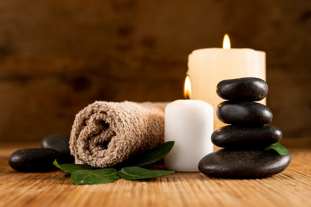 dans une ambiance zen, lumière tamisée, musique douce et encens