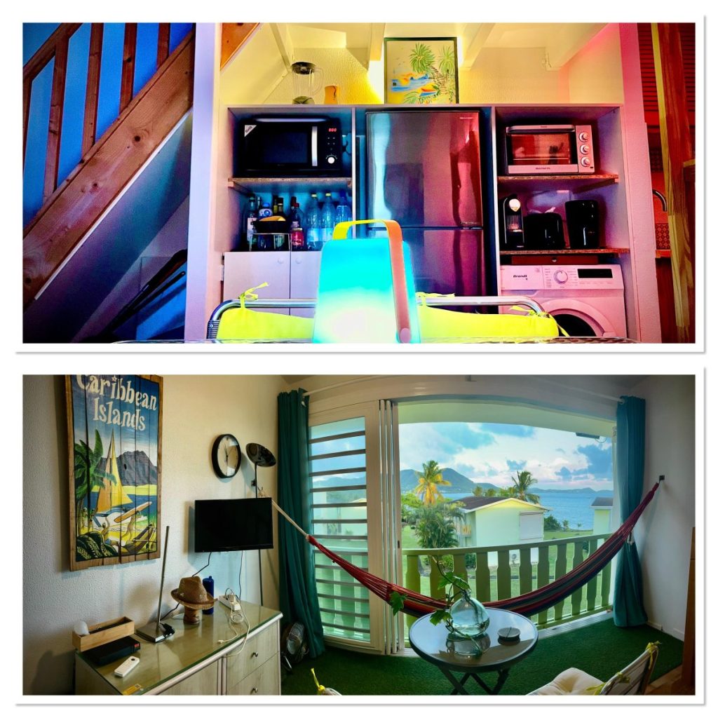 Kitchenette équipée avec mini-four, micro-ondes, bouilloire électrique, machine à café Nespresso, grille-pain, blender, réfrigérateur-congélateur, lave-linge, aspirateur...